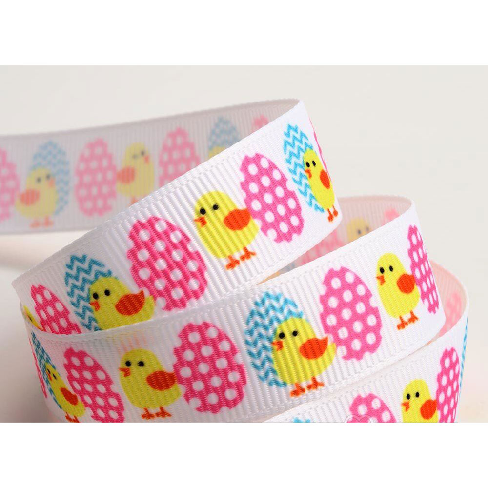 Easter ribbon 16mm wide, perfect for Easter treats. White ribbon with chicks, pink & blue Easter eggs.